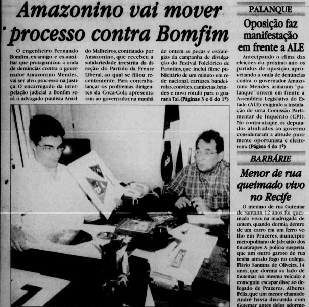 No ano de 1993 a figura de Amazonino estampava nas revistas e capas dos jornais, disparando seu nome na imprensa nacional. O seu filho Armando Clóvis Mendes Negreiros já foi acusado de ser o mandante do assassinato de um empresário em São Paulo e o seu principal assessor, considerado seu “testa-de-ferro” Fernando Bonfim, era uma possível testemunha do crime.