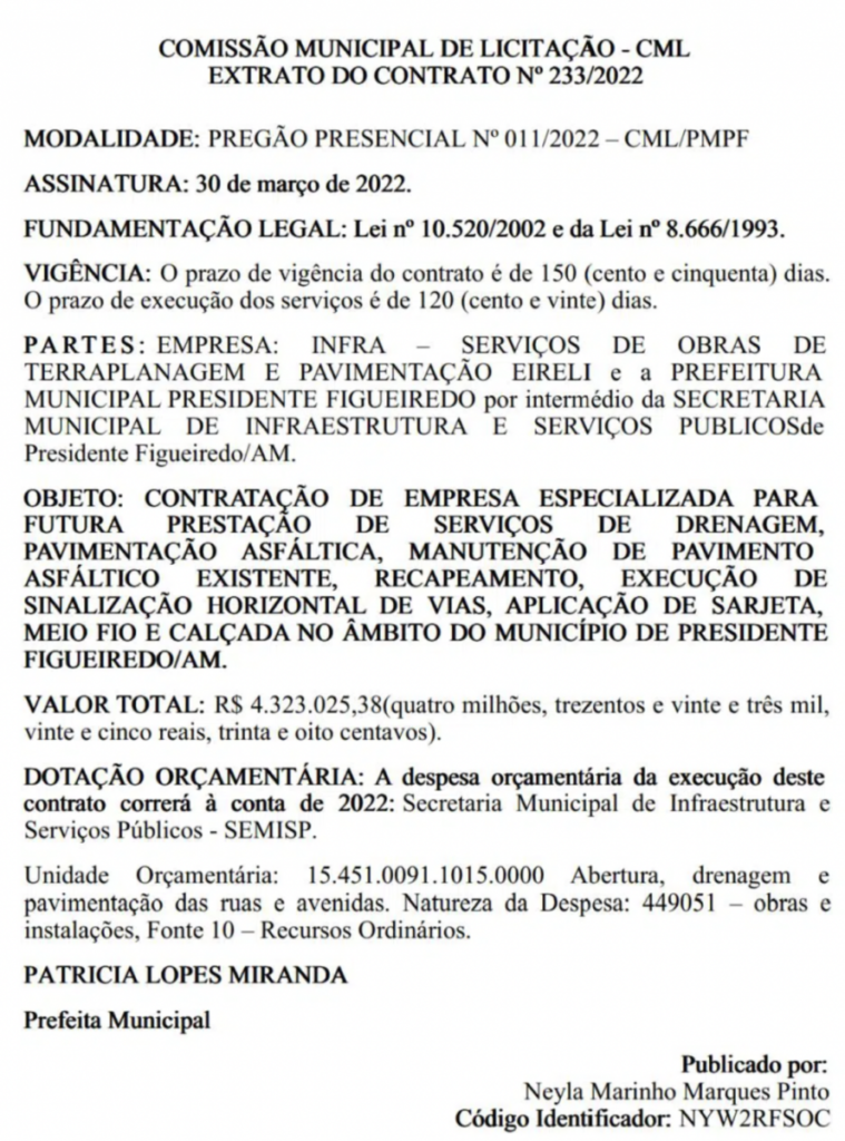 O contrato foi firmado em 30 de março de 2022, cerca de quatro meses depois da prefeitura já ter assinado a contratação de uma empresa especializada em serviços de engenharia para a execução de serviços de recapeamento do sistema viário em Presidente Figueiredo.