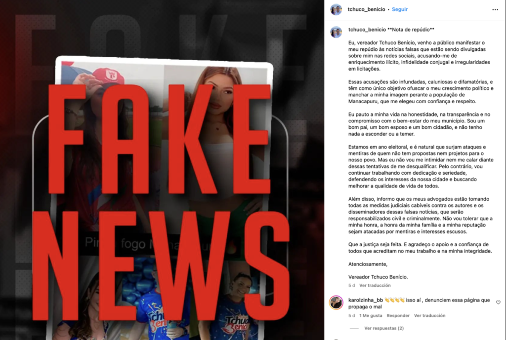 O vereador Tchuco Benício disse em suas redes sociais que é alvo de fake news, negando ter um caso extraconjugal e que não enriqueceu ilicitamente como diz a postagem.