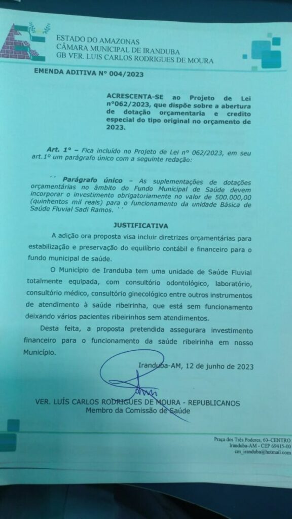 Amazonas – Na última terça-feira (13), durante uma sessão extraordinária da Câmara Municipal de Iranduba, vereadores da base do prefeito Augusto Ferraz rejeitaram uma emenda aditiva no valor de R$ 500 mil destinada à reativação da Unidade Básica de Saúde Fluvial Sadi Ramos, conhecida como balsa UBS. Essa unidade, considerada a mais moderna e bem equipada da cidade, encontra-se parada há mais de dois anos, o que tem gerado grande revolta na população local.