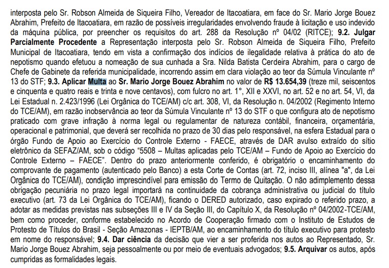 Segundo a denúncia ao órgão ministerial, o prefeito aparelhou sua cunhada, Nilda Batista Cerdeira Abrahim para a chefia do gabinete do município. Para a corte de contas, a conduta de Mario Abrahim viola uma súmula do Supremo Tribunal Federal onde prevê que a contratação de parentes viola a Constituição Federal.