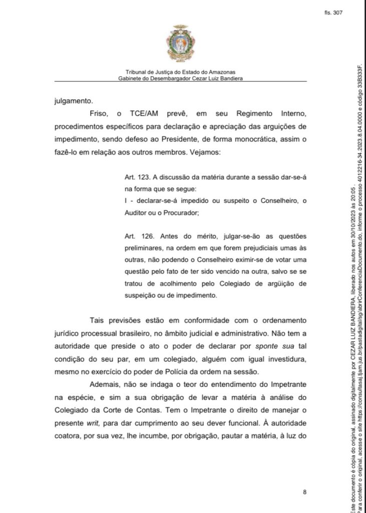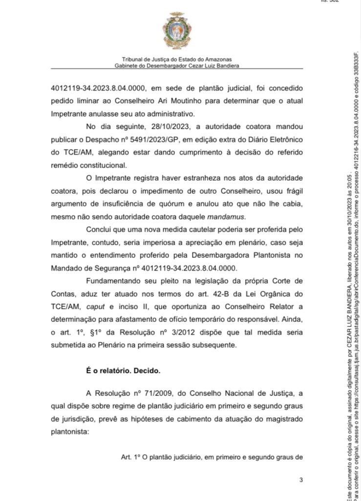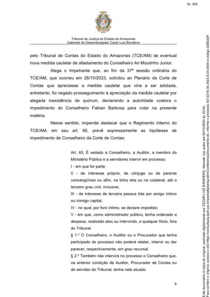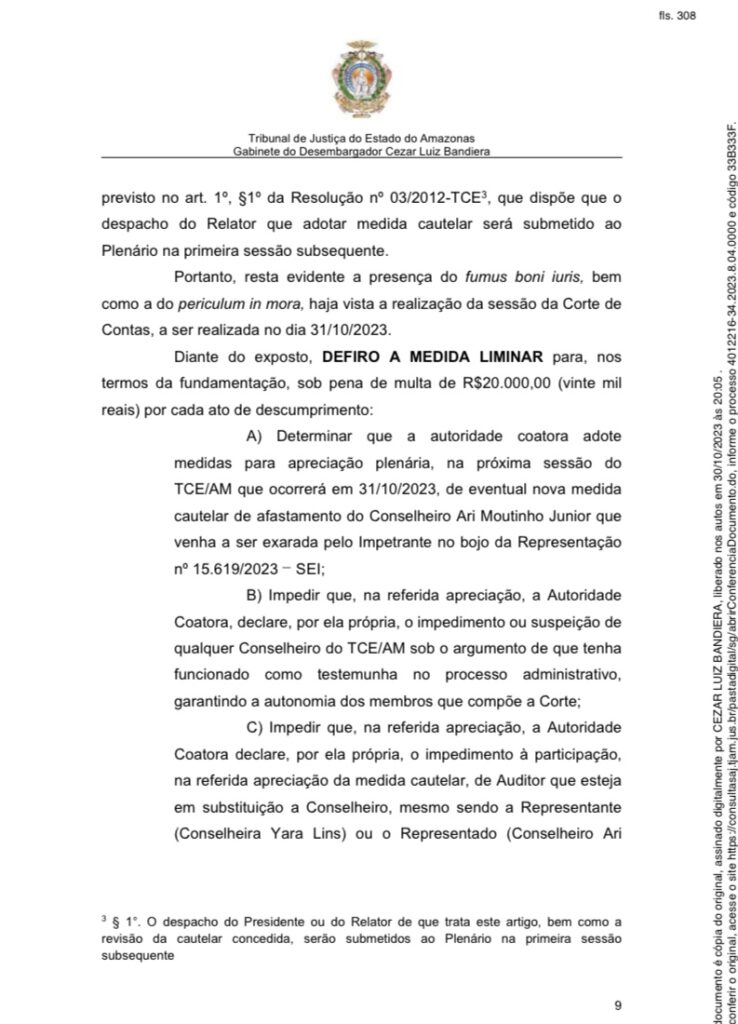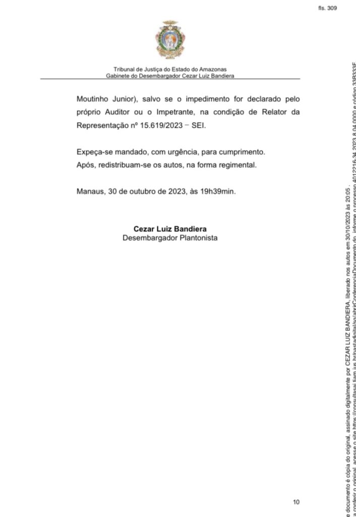 “Determinar que a autoridade coatora adote medidas para apreciação plenária, na próxima sessão do TCE/AM que ocorrerá em 31/10/2023, de eventual nova medida cautelar de afastamento do Conselheiro Ari Moutinho Junior que venha a ser exarada pelo Impetrante no bojo da Representação no 15.619/2023 SEI“, disse o desembargador na decisão.