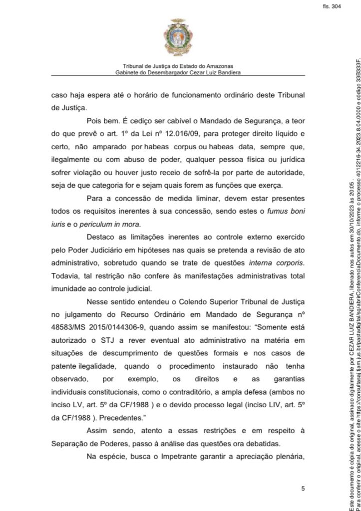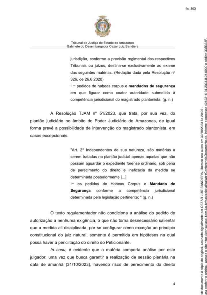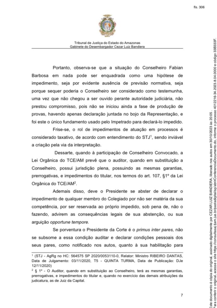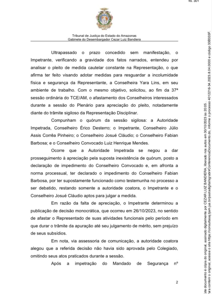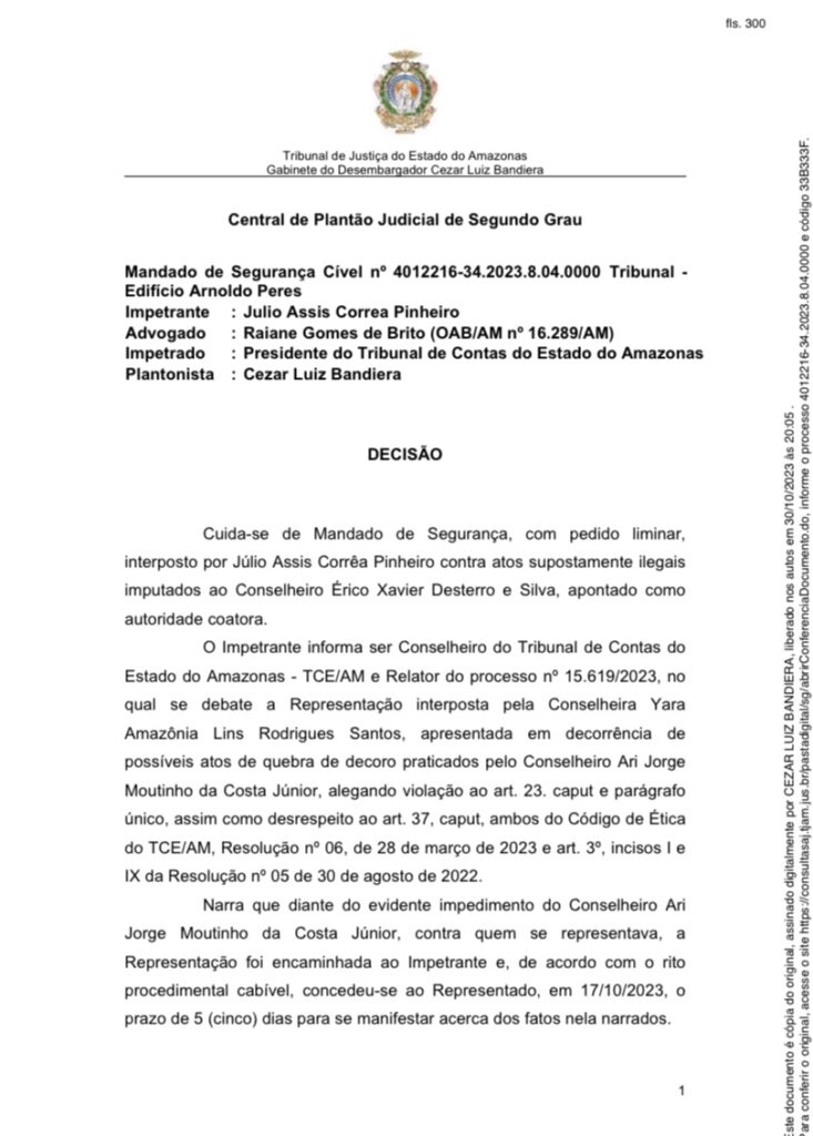 “Determinar que a autoridade coatora adote medidas para apreciação plenária, na próxima sessão do TCE/AM que ocorrerá em 31/10/2023, de eventual nova medida cautelar de afastamento do Conselheiro Ari Moutinho Junior que venha a ser exarada pelo Impetrante no bojo da Representação no 15.619/2023 SEI“, disse o desembargador na decisão.