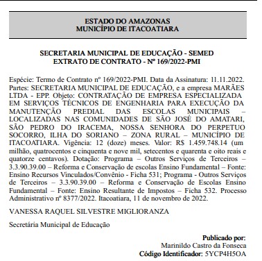 Outra compras suspeitas foram a de equipamentos e máquinas agrícolas. A Prefeitura de Itacoatiara também publicou no Diário Oficial da Associação Amazonense dos Municípios (AAM) que vai gastar R$ 5.755.000,00 milhões na compra de equipamentos e máquinas agrícolas. Dividida em contratos distintos, o primeiro extrato, sob n 054/2023 do dia 13 de junho, assinado pelo Executivo Municipal, destina para a empresa XCMG Brasil Indústria LTDA, o valor de R$ 3.995.000,00 milhões. O outro extrato, de nº 056/2023, a empresa Liugong America Maquinas para Construção Pesada LTDA vai receber R$ 1.760.000,00. Conforme o documento, o objeto do convênio nº 938146/2022 é firmado entre o município e o Ministério da Agricultura.stiça.
