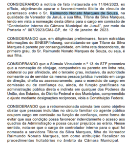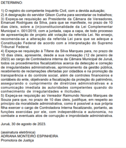 A promotora também emitiu uma requisição ao vereador Raimundo Nonato Marques de Souza, dando-lhe o mesmo prazo de 10 dias úteis para que justifique como é possível sua filha exercer o cargo de Controladora Interna, fiscalizando as funções desempenhadas por ele próprio, com independência e autonomia, no combate a possíveis atos de corrupção e improbidade administrativa.