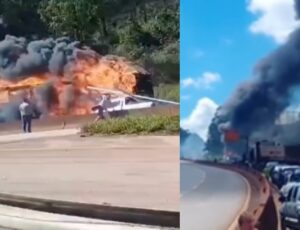 ‘Pânico na estrada!’: ônibus clandestino pega fogo e desce desgovernado a BR-381; veja vídeo