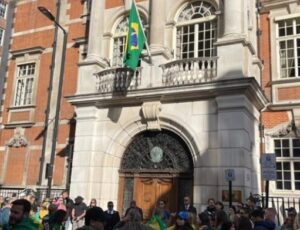 Mundo - O presidente Jair Bolsonaro foi recebido por uma multidão de brasileiros que o aguardavam na porta da embaixada do…